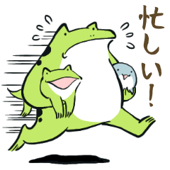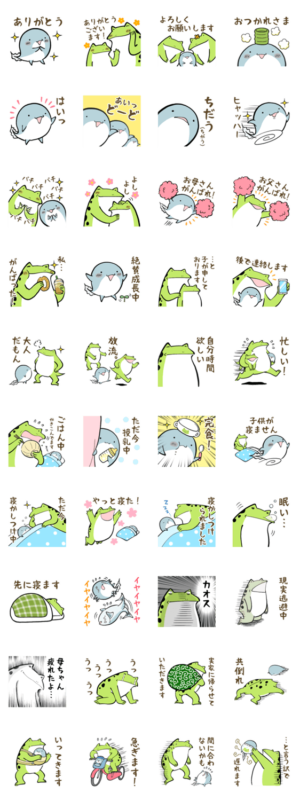 鳥獣戯画チックなカエルの子育てスタンプ。子育ての様々なシーンで使えます!手が離せない時にシュッと送ってくださいね。子ガエルやオタマジャクシが大活躍です。ユウコトリトリ より発売