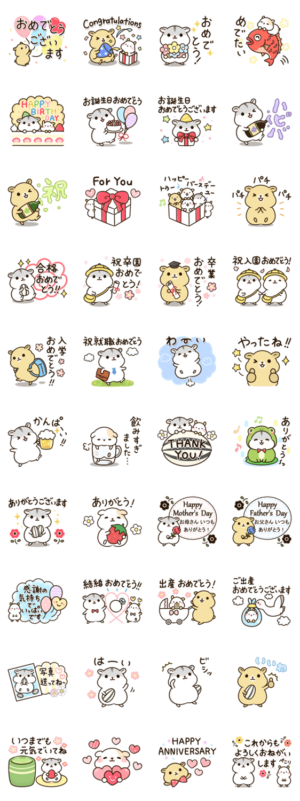 ぽっちゃりしたハムスターのスタンプです。おめでとうや誕生日、結婚、出産、母の日、父の日など、お祝いの言葉がたくさんつまったスタンプです。よつば より発売