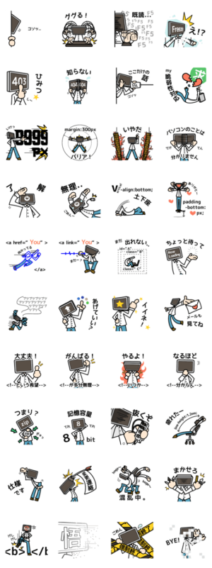 パソコンのネタを元にしたパソコン頭のひとことスタンプです。一部htmlやcss等web関係のネタ有。NiBitag より発売