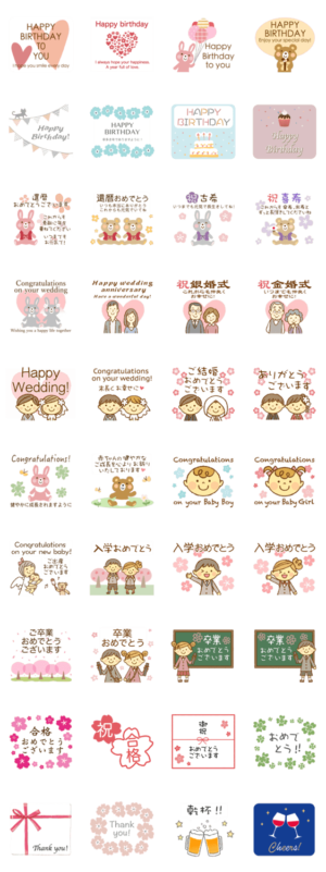 誕生日、入学、卒業、結婚、出産、金婚式、還暦等のお祝いに使えるスタンプです。ほのぼの系、大人かわいい系等ありますので、いろんな方に使っていただけたら幸いです。