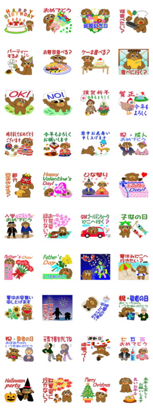 犬 ワンコ が紹介する正月からクリスマスまでの行事スタンプ! 年賀は、猿 鳥 犬 (申 酉 戌)年、誕生日や、バレンタインデー、母・父の日などがあります。