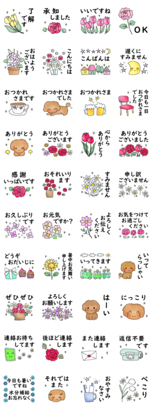 文字が大きくて見やすい、シンプルな大人の敬語スタンプ。夏に便利な暑中見舞いや感謝の言葉、日常の挨拶など、気持ち伝わる花いっぱいの40個です。
