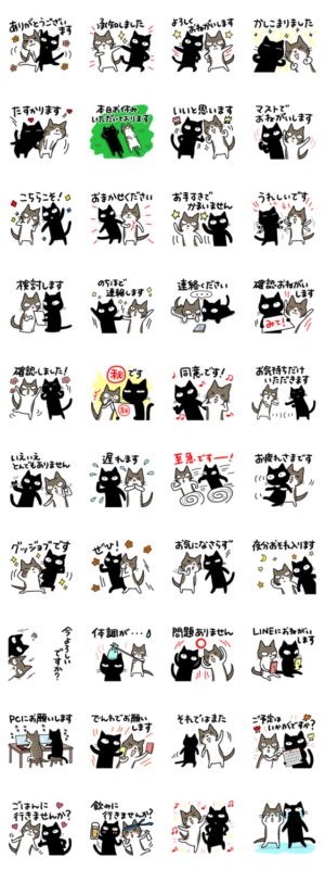黒猫「ナノ」とキジシロ「きなこ」 のスタンプ。 会社の同僚や先輩に使えるスタンダードなお仕事敬語編!もちろん友達や家族にも使えます!ぱるぱ-る より発売
