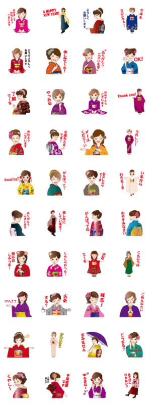 艶やかで、華やかな着物美人のスタンプです。七五三やお正月、これからの時期やお祝い行事によせたスタンプをどうぞ。新年やあけおめスタンプとして使えます。