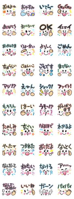便利で大きな顔文字と、毎日使えるあいさつや言葉をピックアップ。誰にでも使いやすく、ポップな印象を演出しました。楽しく使いこなそう!