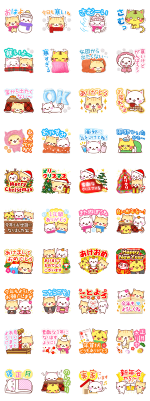 冬に使える猫たちのスタンプ!クリスマス、年末年始(大みそか/正月/年賀状)のイベントにも♪あけましておめでとうなど新年の挨拶も入ってXmasからお正月まで使えます♪