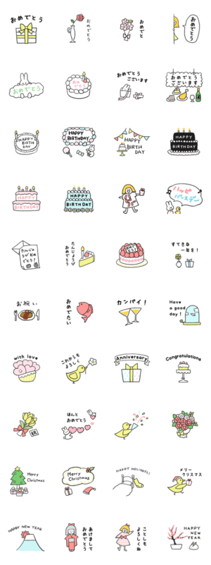 シンプルなおめでとう系スタンプです。お誕生日やちょっとしたお祝いに。クリスマスとお正月も。Maki より発売