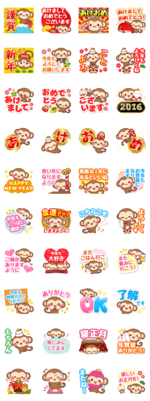 2016年の正月に使える猿のスタンプ♪あけましておめでとうございます、今年もよろしくお願いします、Happy New Yearなど新年の挨拶も入ってます。年賀状代わりにどうぞ♪Miho Kurosu より発売