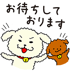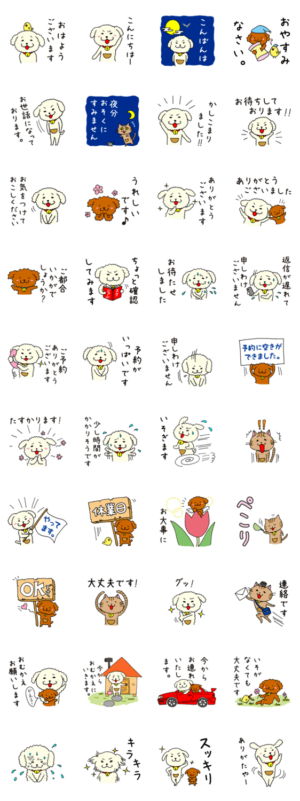 トリマーさんや自営業、接客業、店員さんにオススメ!マルチーズみたいな悪人顔の白プードル&能天気な茶プーとキジ猫の敬語あいさつスタンプ。お客様とのやりとりに便利!
