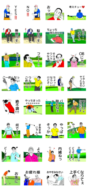“おやじのゴルフ”第二弾! ゴルフおやじ達の心の叫び、苦悩と悶絶、歓喜と分かち合いの一コマをスタンプにしました。日々のゴルフコミュニケーションにご利用ください。タナカミノル より発売