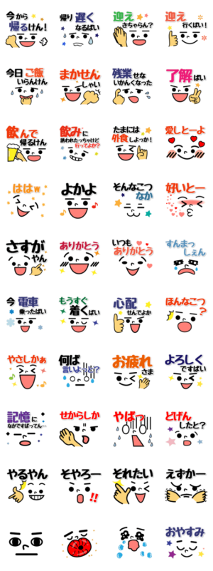 博多弁のパパ(男性)目線の顔文字スタンプです。旦那さんからママ(奥さん)へ使える言葉がいっぱい。家族以外でも友達や同僚へも日常よく使う博多弁がいっぱい♪