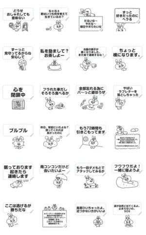 振られた次の日のうさぎの絵が、可愛くメッセージを届けてくれます。第四弾は100文字まで好きな言葉を入れられる、メッセージスタンプバージョンです。 現在この商品は一部のスマートフォン版LINE 10.3.0以上のトークルームでのみ使用できます。動作環境の最新情報はヘルプをご確認ください。はなうたるらら より発売