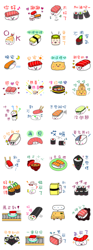 日本食の代表であるお寿司たちの中国語(繁体字)日常会話のスタンプです。かわいいお寿司のキャラクターたちが日常会話を代弁してくれます♪うさぎとくま より発売