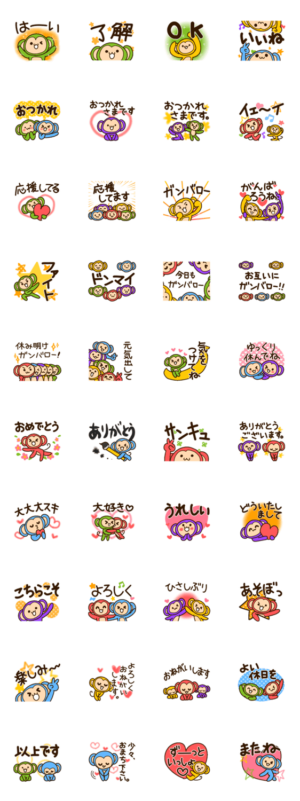 応援するスタンプが中心の5色(緑、黄色、青、赤、紫)の元気な猿のスタンプ。挨拶もあります。株式会社KSF より発売