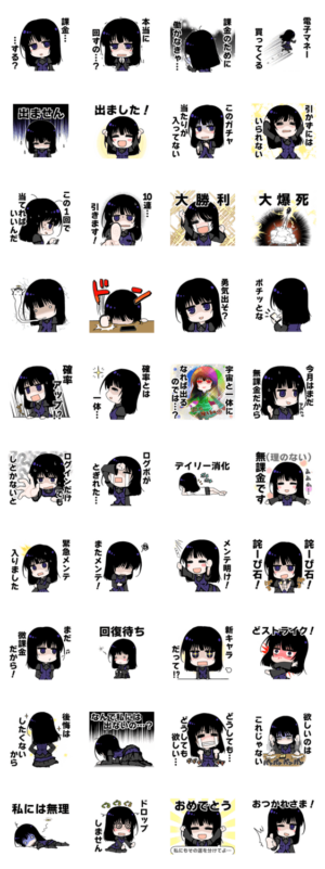 ソシャゲにハマってしまった女子、ネガ子のスタンプです。ネガ子は基本的にネガキャラで、成人済のオタク女子。毎日のように課金とガチャの誘惑に振り回されています。ぜろな より発売