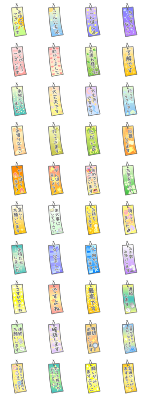短冊に言葉が書いてあるBIGスタンプです♪ よく使う軽めの敬語や、祈りの言葉が書いてあります♡ 気持ちや祈りがしっかり伝わりますように☆ ozpop1974 短冊BIGスタンプ ※このスタンプはトークルームで大きく表示されるBIGスタンプです。ozpop1974 より発売