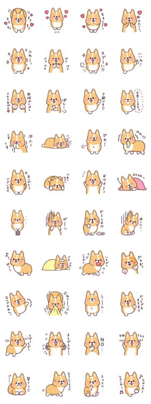 「まるまるコーギー」の第2弾!まるまるしたコーギーのかわいい表情いっぱいのスタンプです。第1弾と合わせて使ってみてください☆つじなつみ より発売