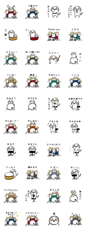 バンド生活でよく使うスタンプをドラム犬バージョンで作りました。犬種モデルはシーズーです。第2弾。