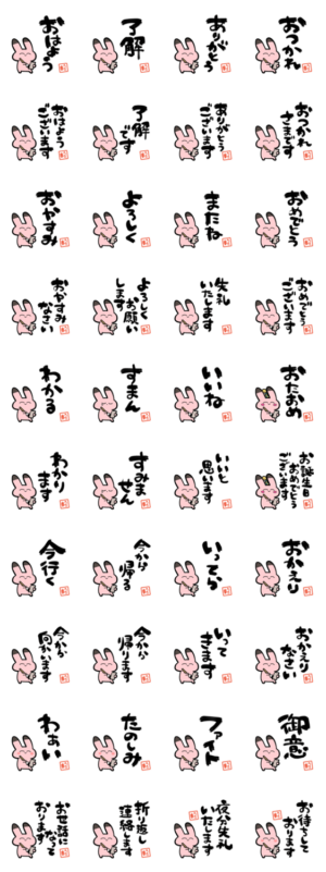 大したことのない事をさも格言かのように言うウサギのスタンプです。敬語もあります。格言ぽく言うネコより少しにこやかです。見やすく大きい文字で挨拶する時にどうぞ。