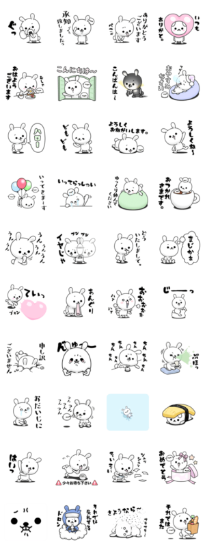 ひねくれうさぎシリーズ第15弾!使いやすい言葉を集めたあいさつ編。なんかまるいのもいる…。(以前販売していたスタンプの再販です。)