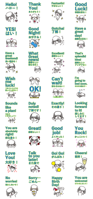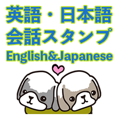 英語と日本語のテキストの入ったシーズー犬のスタンプ。英語勉強中、日本語勉強中の方、海外のお友達の多い方。日本にいる英語スピーカーの方にお使いいただけます。 ※このスタンプはトークルームで大きく表示されるBIGスタンプです。erihori より発売