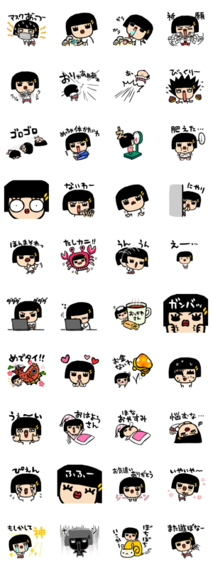 おかっぱ頭の女の子、ヘルメットはちえさんのスタンプ第3弾です。ゆるい関西弁でおもしろ可愛くいきましょう。ウチガキナホコ より発売