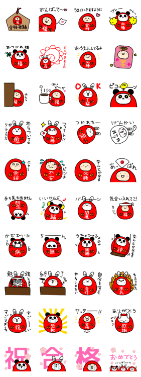 受験生を応援する合格祈願スタンプです。勉強や試験を頑張るあの人に送って元気を届けよう。パンダとうさぎもだるまになって応援します。なるようになるさ!