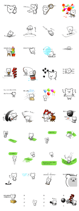 吹き出しを隠したり壊したり塗りつぶしたり。使ってみて初めて分かる、会話を楽しくするくまのスタンプです。ふきだしが見やすい様に白以外の背景で使って下さい。