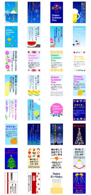 暑中お見舞い申し上げます、残暑、夏のあいさつなど プラス 年賀の挨拶、クリスマスカード、バースディーカードなど盛だくさん ※このスタンプはトークルームで大きく表示されるBIGスタンプです。
