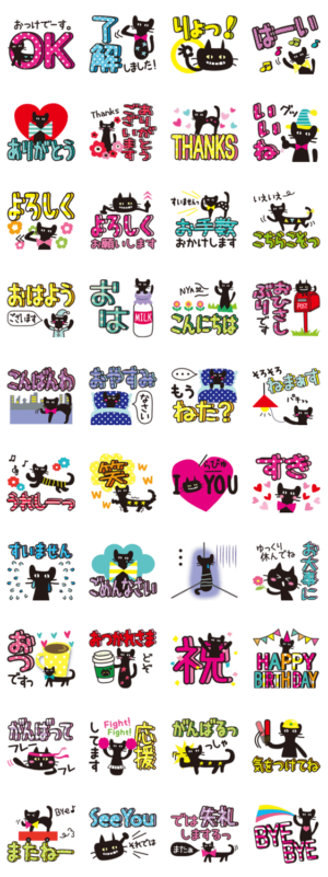 デフォルメされたくろねこの文字入りスタンプです。にぎやかなスタンプをラインに飾ってトークを盛り上げましょう。