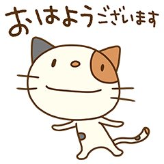 三毛猫のミーニャ。今回は挨拶編。「おはよう」「こんにちは」から「おやすみなさい」まで。気持ちよく、身近な人へ挨拶を届けよう。家族、学校、お仕事でも。Mami / エストループ より発売
