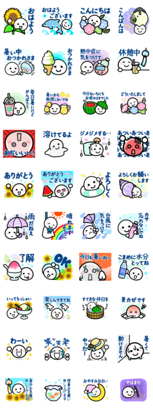 ほわいとさんの夏のスタンプです。基本的な挨拶や敬語も入っていて毎日使えます。(暑さ、熱中症、雨、台風)なかむら けんたろう より発売