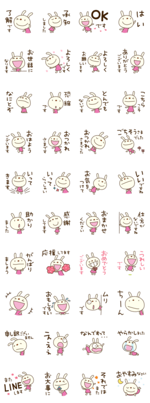 敬語大好き☆てるてるうさぎ スタンプに書いてある文字一覧