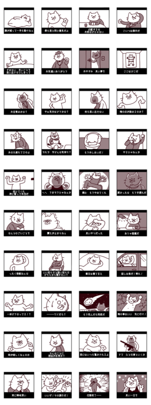 ゆるカワだけどかっこいい、そんなしろねこさんが演じる洋画や海外ドラマの字幕風スタンプ第2弾。多分SFアクションギャング映画(B級)。日常会話でも煽り系でも使えます。