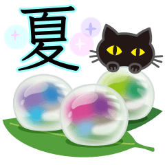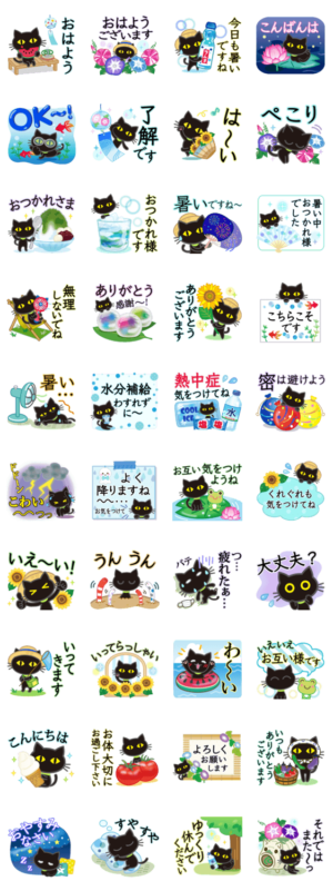 さわやかな夏の黒猫スタンプです。大雨災害.熱中症.コロナ…心配が多い季節に是非☆程よく敬語まじりで年上にも便利☆風鈴.かき氷.金魚…涼しさをトークでお届けしましょ♪