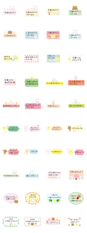 友達、ママ友、先輩、後輩に送る春の吹き出しスタンプです!敬語あり!花見のお誘いスタンプあり!小さなかわいい動物たちと新生活のトークを楽しんでください♡