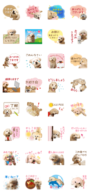 かわいいトイプードル犬のスタンプです。敬語入りの便利な基本スタンプで、可愛すぎない大人にやさしい文です。