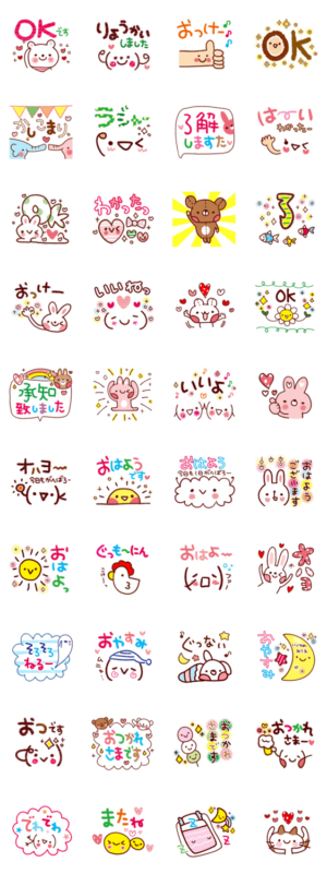 特によくつかう「OK」や「了解」。毎日のあいさつ言葉をいっぱい入れた、カラフルで使いやすいスタンプです。