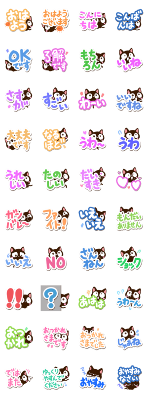 『小さい黒猫スタンプ』から、カラフルな【大文字】版になります。カラフルな大きい文字で、インパクトがあります。黒猫好きな方にぜひ。【かたこ】