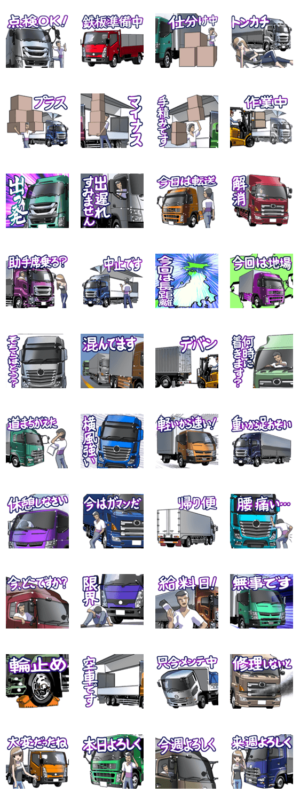 トラッカーのためのクルマスタンプです。車(トラック業務1)に足りなかった言葉を中心に台詞がダブらない、合わせて使える補完版です。