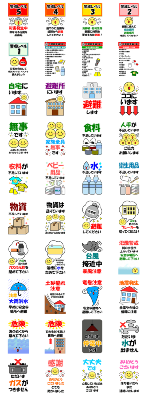 自然災害警戒の呼びかけや、安否確認のためのスタンプです。