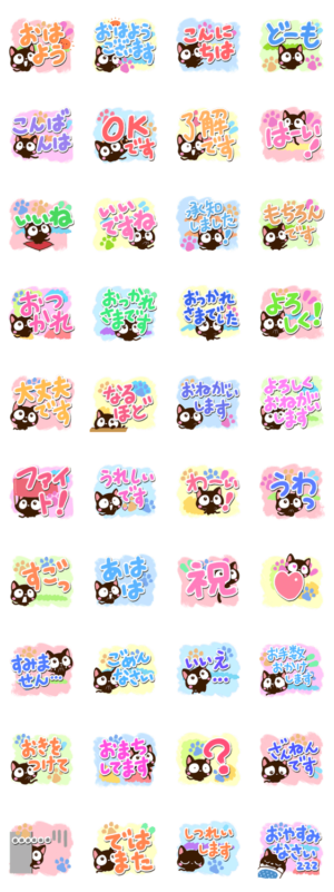【小さい黒猫スタンプ】から油絵編です。油絵の具風にカラフルに仕上げました。基本的な言葉を集めた使いやすいスタンプです。黒猫好きな方にぜひ。【かたこ】