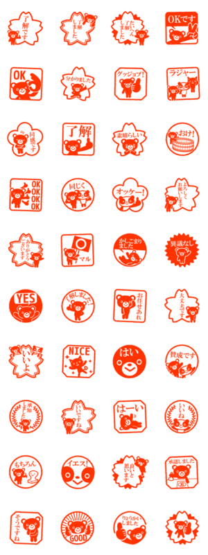 かわいいクマとその友達が登場するハンコ風のスタンプ第4弾。今回は「了解」「OK」などの肯定的なメッセージのセットです。