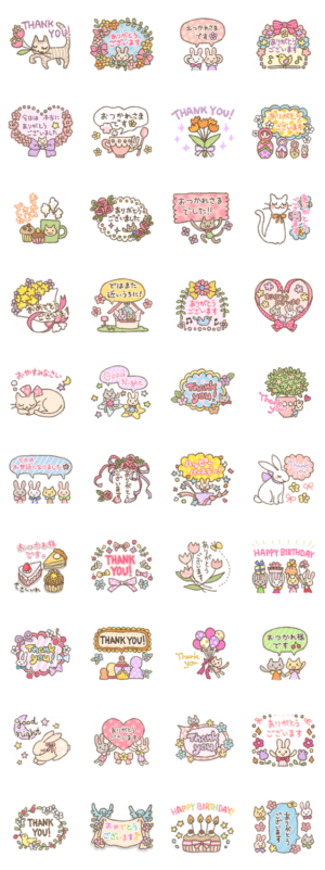 ありがとう&おつかれさま&おめでとう!をまんべんなく。うさぎや猫やお花いっぱいでメルヘン。相手を選ばず使えます。
