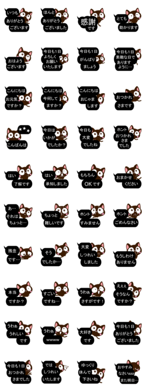 『小さい黒猫スタンプ【黒い吹き出し編】』から文字をいっぱい追加した、使いやすいスタンプになります。基本的な言葉を集めました。クロネコ好きな方にぜひ。【かたこ】