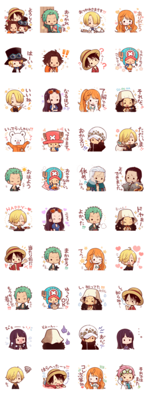 ONE PIECEの毎日使えるゆるいスタンプです。ルフィ、ゾロ、サンジ、ロー、エース、サボ等…毎日使えるリアクションや挨拶が沢山はいっています。一年の限定配信です♪