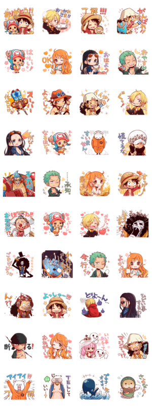ONE PIECEの毎日使えるスタンプです。ルフィ、ゾロ、サンジ、ナミ、ウソップ、チョッパー等…毎日使えるリアクションや挨拶が沢山はいっています。一年の限定配信です♪