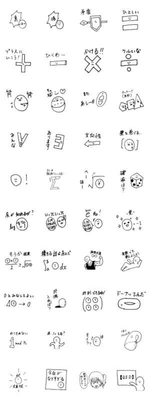 数学科に所属する学生は、多大なる闇を抱えています。彼らが少しでも社会に受容されるように、数学を絡めたスタンプを作りました。三角関数ちゃそ より発売