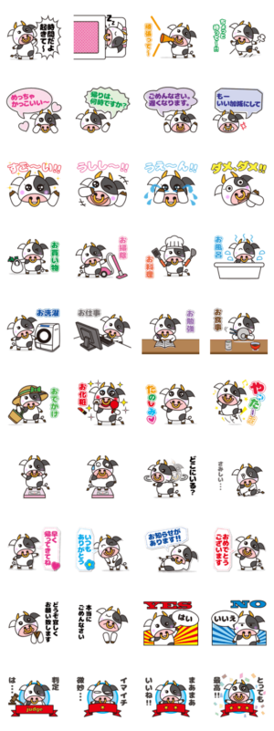 干支 丑(牛) 。ウシは、牧場にいる子供や女性にも人気の動物です。自分の大切な家族やパパ、身近なお友達との日常の会話にどうぞ。
