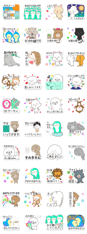 ふきだしに被る動物達、うざいけど愛があります♪敬語が多めで文字も大きな日常会話です。お疲れ様、ありがとう、よろしく、頑張って、お大事になどが多めのセットです♪